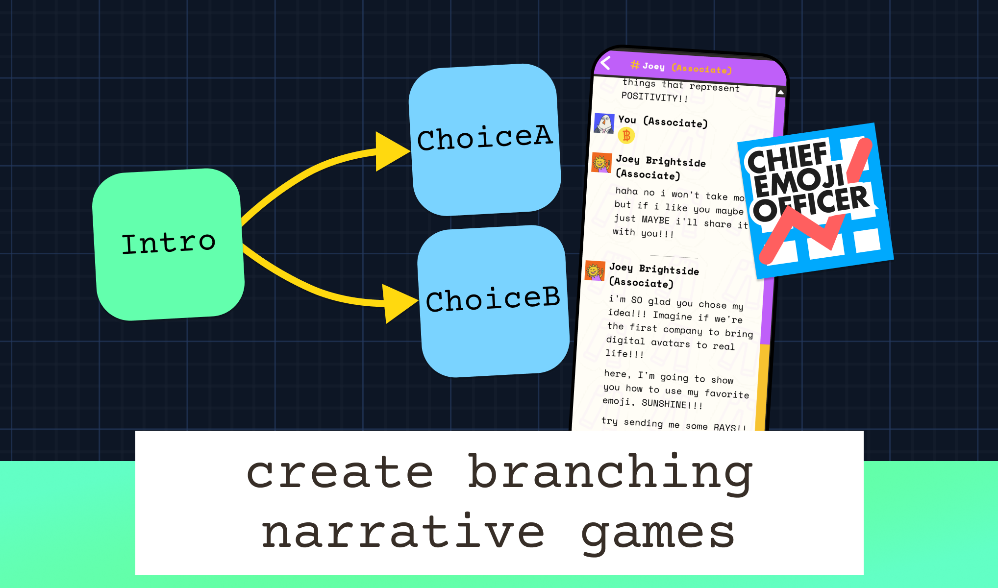 Fast forward a couple of years, and we were using Yarnspinner for Chief Emoji Officer. I was struggling to jump back and forth in a document to see where the dialogue led. So I suggested we take a look at integrating Twine to make the process for writing chapters more visual. That way, we’d be able to clearly see branches, where specific choices happened, and where we unlocked new content like channels, emojis, and achievements. Once we did it got much easier to write quickly and analyze what we were missing in each chapter.